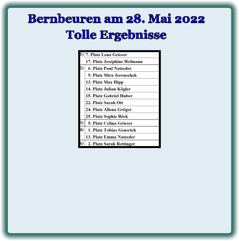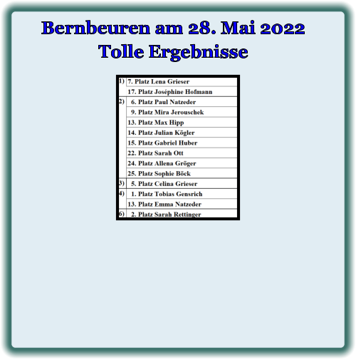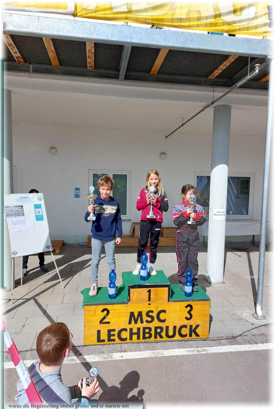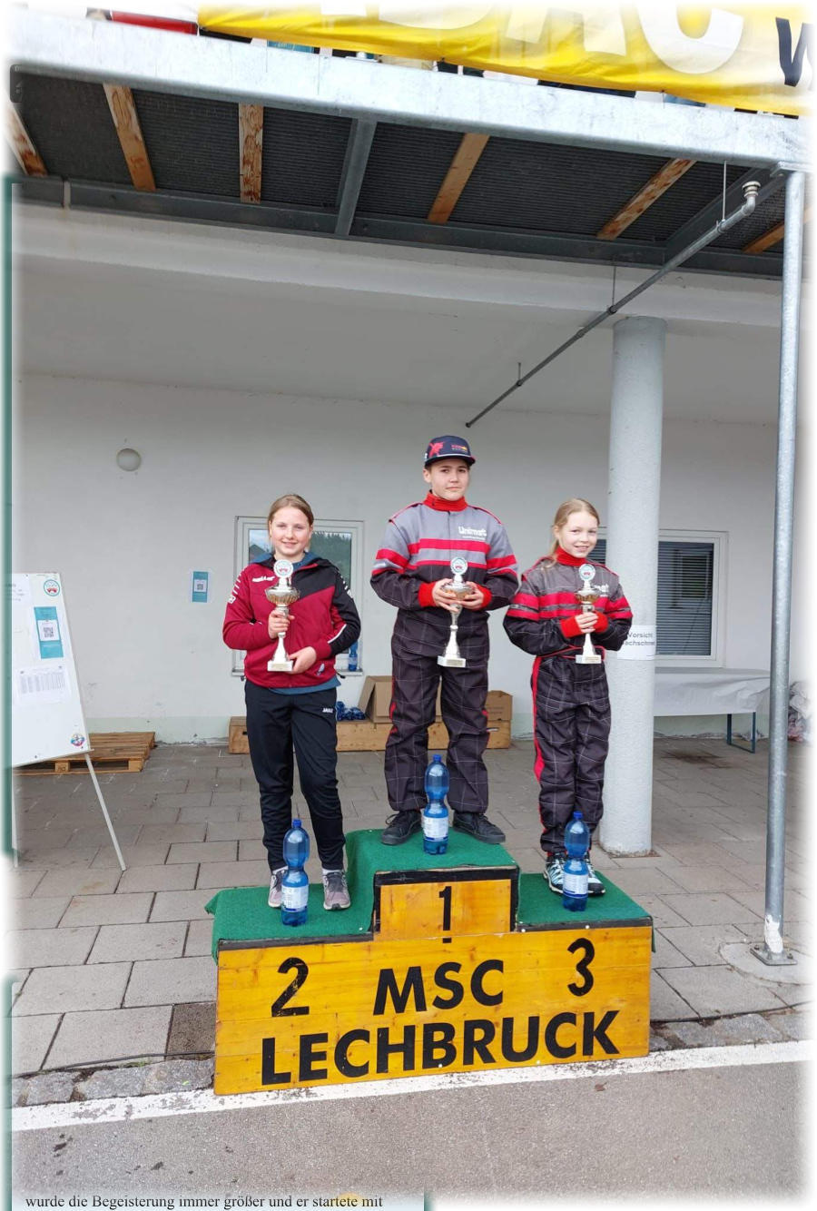 Bernbeuren am 28. Mai 2022Tolle Ergebnisse Wir möchten uns an dieser Stelle nochmals bei allen bedanken, die uns das ganze Jahr 2022 über so tatkräftig unterstützen – Eltern, Trainer, Geschwister, Verwandte, Freunde, Vereinsmitglieder und natürlich bei den Sponsoren.  Zum Saisonende traten wir am 31.07.2022 beim MSC Marktoberdorf zur ADAC Südbayern Mannschaftsmeisterschaft im Jugendkartslalom an. Lena Grieser durfte aufs Treppchen und sich über einen ersten Platz freuen. Paul Natzeder landete auf dem 14. Platz in der K2. Celina Grieser durfte in der K3 aufs Treppchen und freute sich über ihren dritten Platz. Tobi Gensrich schaffte es in der K4 auf den vierten Platz. In der Mannschaftswertung schafften wir es aufs Treppchen – hervorragender dritter Platz – HURRA.  Voller Vorfreude ging es zum Endlauf der südbayerischen Kartslalom Meisterschaft beim Racing Team Königsbrunn am 23. und 24.07.2022. Ausgestattet mit neuen T-Shirts für Fahrer und Eltern gesponsert vom Bauunternehmen Toni Ungelert gingen wir bei tropischen Temperaturen an den Start. Lena Grieser stellte ihr Talent unter Beweis und fuhr auf einen hervorragenden sechsten Platz von 24 Teilnehmern in der K1. Nicht ganz so gut ging es Paul Natzeder mit einem 21. Platz und Mira Jerouschek mit dem 28. Platz – von insgesamt 29 Startern in der K2. Celina Grieser belegte den zehnten Platz von 24 Startern in der K3.  Herzlichen Dank an die Firmen Opel Meier, Bauunternehmen Toni Ungelert, Versicherungsmakler Ulrich Leiterer, Stefan Leiterer Haustechnik und Baggerbetrieb Natzeder die unsere neuen Rennanzüge gesponsert haben.   In der Gesamt-Klassenwertung erreichte Lena Grieser in der K1 einen herausragenden 1. Platz und qualifizierte sich somit zum Endlauf um die Südbayerische Meisterschaft.  Ebenso Paul Natzeder in der K2 mit einem hervorragenden 2. Platz und Mira Jerouschek mit einem super 8. Platz. Den gleichen Erfolg konnte Celina Grieser in der K3 mit ihrem 2. Platz erzielen. Als Mannschaft haben wir uns ebenfalls für den Südbayerischen Endlauf am 31.07.2022 beim MSC Marktoberdorf qualifiziert – ein herzliches Dankeschön an alle Fahrerinnen und Fahrer, ohne euch hätte das nicht geklappt. Abschließend gings noch zum AC Garmisch-Partenkirchen am 17.07.2022 K1)	2. Platz Lena Grieser 	12. Platz Joséphine Hofmann K2)	2. Platz Paul Natzeder 	9. Platz Sarah Ott 	12. Platz Mira Jerouschek 	13. Platz Gabriel Huber 	20. Platz Max Hipp K3)	5. Platz Celina Grieser K4)	5. Platz Tobias Gensrich  Am 5. Lauf zur Südbayerischen Meisterschaft sowie dem 9. Lauf um den Zugspitzpokal und einem Lauf zur MOR startete unsere Truppe am 10.07.2022 beim MSC Ohlstadt K1)	2. Platz Lena Grieser 	16. Platz Joséphine Hofmann K2)	3. Platz Paul Natzeder 	8. Platz Mira Jerouschek 	12. Platz Sarah Ott 	17. Platz Gabriel Huber 	29. Platz Max Hipp K3)	4. Platz Celina Grieser K4)	12. Platz Tobias Gensrich 	22. Platz Emma Natzeder 	25. Platz Fabian Schwingshandl Kuchenverkauf beim Kunstmarkt am 09./10. Juli 2022 – Erlös geht an den Nachwuchs des MSC. Wie in den letzten Jahren sorgten die örtlichen Vereine für die Verpflegung der zahlreichen Besucher. Der MSC Lechbruck übernahm wieder den Verkauf von Kaffee und Kuchen – und konnte dem Andrang fast nicht standhalten: 450 Tassen Kaffee und ca. 800 Stück Kuchen und Torte wurden verkauft. Wir bedanken uns im Namen unseres Nachwuchses nochmals ganz herzlich bei allen Bäckerinnen und Bäckern.  Weiter ging es am 03.07.2022 beim Nachbarverein MSC Steingaden K1)	2. Platz Lena Grieser 	12. Platz Joséphine Hofmann K2)	6. Platz Mira Jerouschek  	9. Platz Paul Natzeder 	12. Platz Gabriel Huber 	14. Platz Max Hipp 	15. Platz Sarah Ott 	17. Platz Julian Kögler K3)	9. Platz Celina Grieser K4)	9. Platz Emma Natzeder 	12. Platz Fabian Schwingshandl 	16. Platz Tobias Gensrich  Rennen beim MC-Neuhausen München am 26.06.2022 K1)	1. Platz Lena Grieser 	15. Platz Joséphine Hofmann K2)	4. Platz Paul Natzeder 	9. Platz Sarah Ott 	15. Platz Gabriel Huber 	21. Platz Mira Jerouschek K3)	3. Platz Celina Grieser K4)	9. Platz Tobias Gensrich 	12. Platz Emma Natzeder  Auf neuem Terrain bewegten sich unsere Jugendlichen am 09.07.2022 in Steingaden. Dort fand ein Lauf zum Bayerischen ADAC eKartslalom statt. Es war eine Umstellung auf die andere Antriebsart, was natürlich auch das Fahrverhalten beeinflusste. Trotzdem konnten wir mit super Ergebnissen nach Hause fahren: K1)	2. Platz Lena Grieser K2)	2. Platz Paul Natzeder 	8. Platz Mira Jerouschek 	13. Platz Max Hipp 	15. Platz Gabriel Huber K3)	6. Platz Celina Grieser K4)	3. Platz Tobias Gensrich 	13. Platz Emma Natzeder 	16. Platz Fabian Schwingshandel