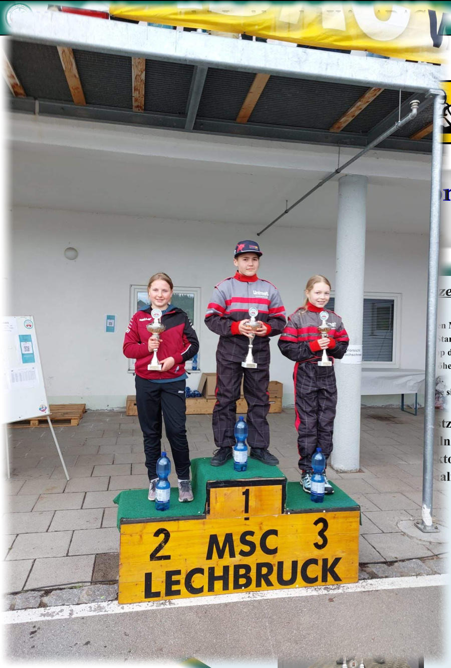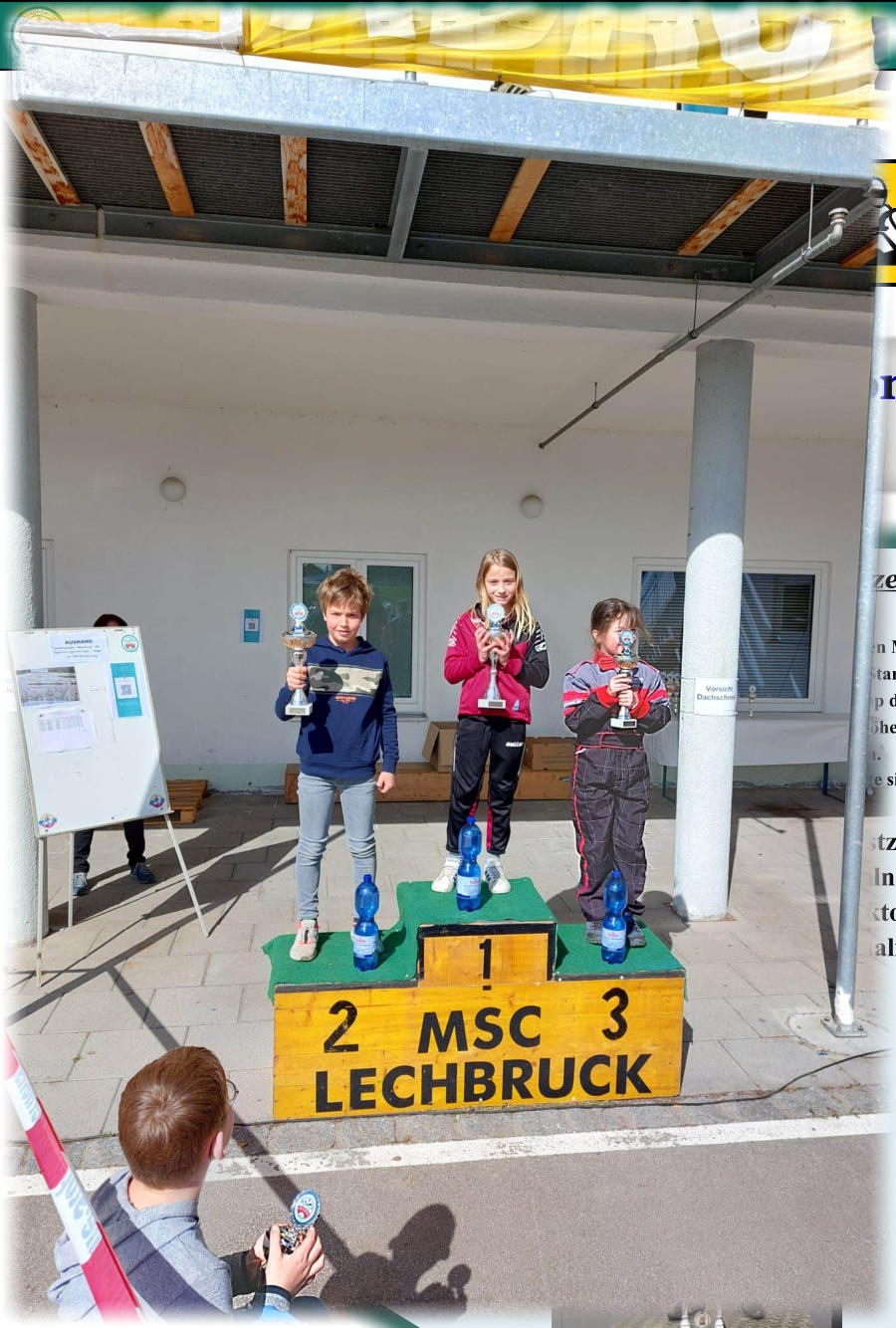 Nach zwei Jahren Pause konnte der MSC Lechbruck am 24. April 2022 wieder einen Laufim Jugend-Kart-Slalom in der Region Süd sowie zum Zugspitzpokal und der Münchner Oberlandrunde veranstalten. Gewertet wurde diese Veranstaltung als Südbayerischer Meisterschaftslauf mit den teilnehmenden Vereinen MSC Lechbruck, MSC Steingaden, AMC Bernbeuren, MSC Ohlstadt, MSC 12-München, Rapid Lechrain, MSC Olching, MSC Hausham, MSC Geretsried und MSC Altenstadt.Bei trockener Witterung standen 115 Starter und Starterinnen am Start und warteten darauf, den Parcours zu Fuß zu lernen und danach in den Karts mit einem Trainings- und zwei Wertungsläufen absolvieren zu können.Geschick und Können war für den Parcours notwendig – einfach machten es die Lechbrucker ihren Gästen nicht. Unfallfrei und ohne Schäden verlief die Veranstaltung nach den Wünschen der Gastgeber.In der…K1 schaffte es Lena Grieser aufs Siegertreppchen ganz oben und erreichte den 1. Platz. K2 fuhr Paul Natzeder auf den 2. Platz, Mira Jerouschek landete auf Platz 6, Maximilian Hipp auf 12, Gabriel Huber auf 14, Julian Kögler auf 16 und Sarah Ott auf Rang 18.Celina Grieser schaffte in der K3 ebenso einen hervorragenden 2. Platz.K4 fand sich Tobias Gensrich auf dem 4. Rang, Emma Natzeder auf Platz 14 und Fabian Schwingshandl auf Rang 16.Die K6 gewann Sarah Rettinger und rundete das hervorragende Ergebnis der Lechbrucker Kartfahrer ab. Der MSC bedankt sich bei allen Teilnehmern, Eltern, Gästen, Helfern und Anwohnern.